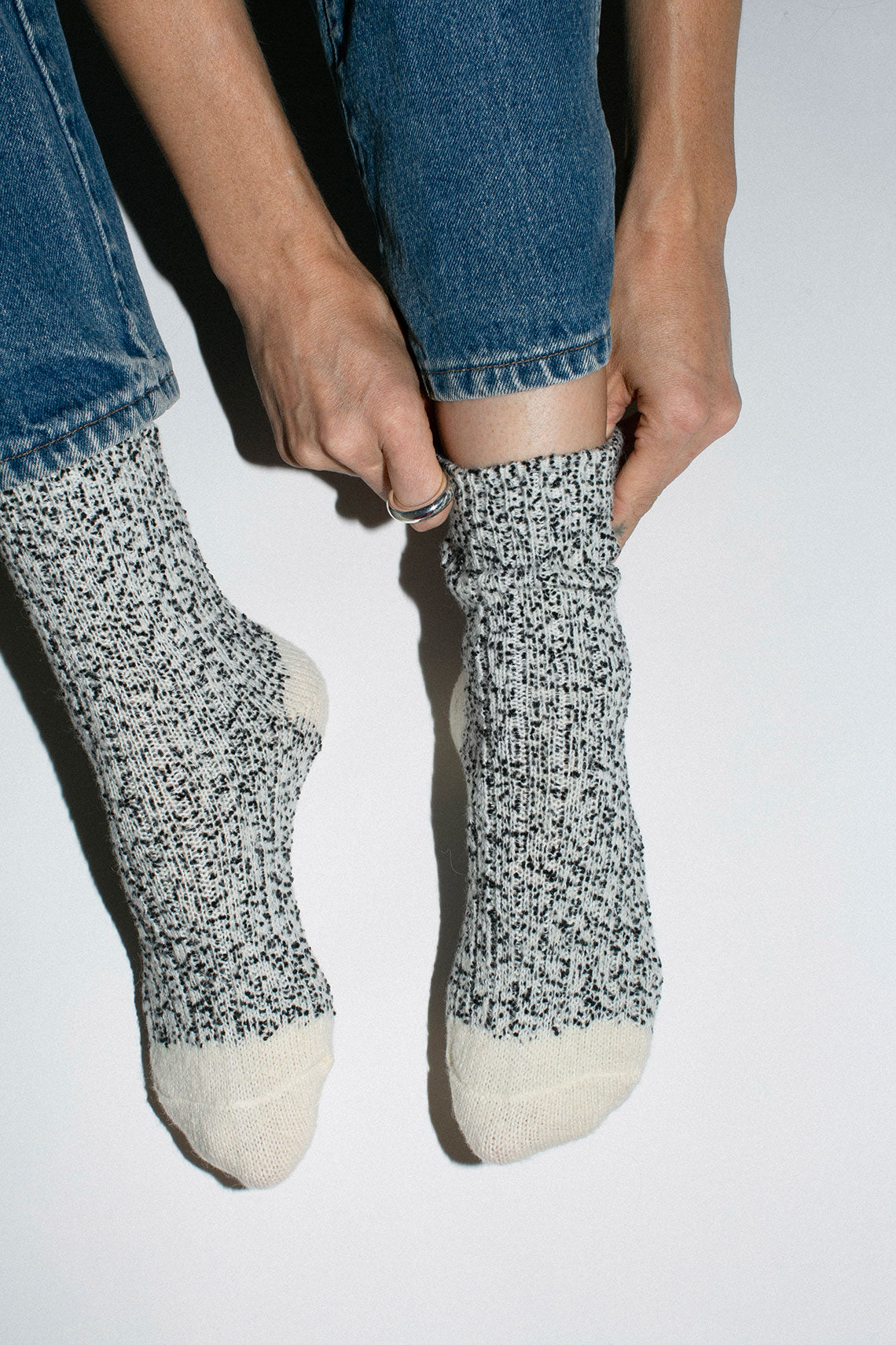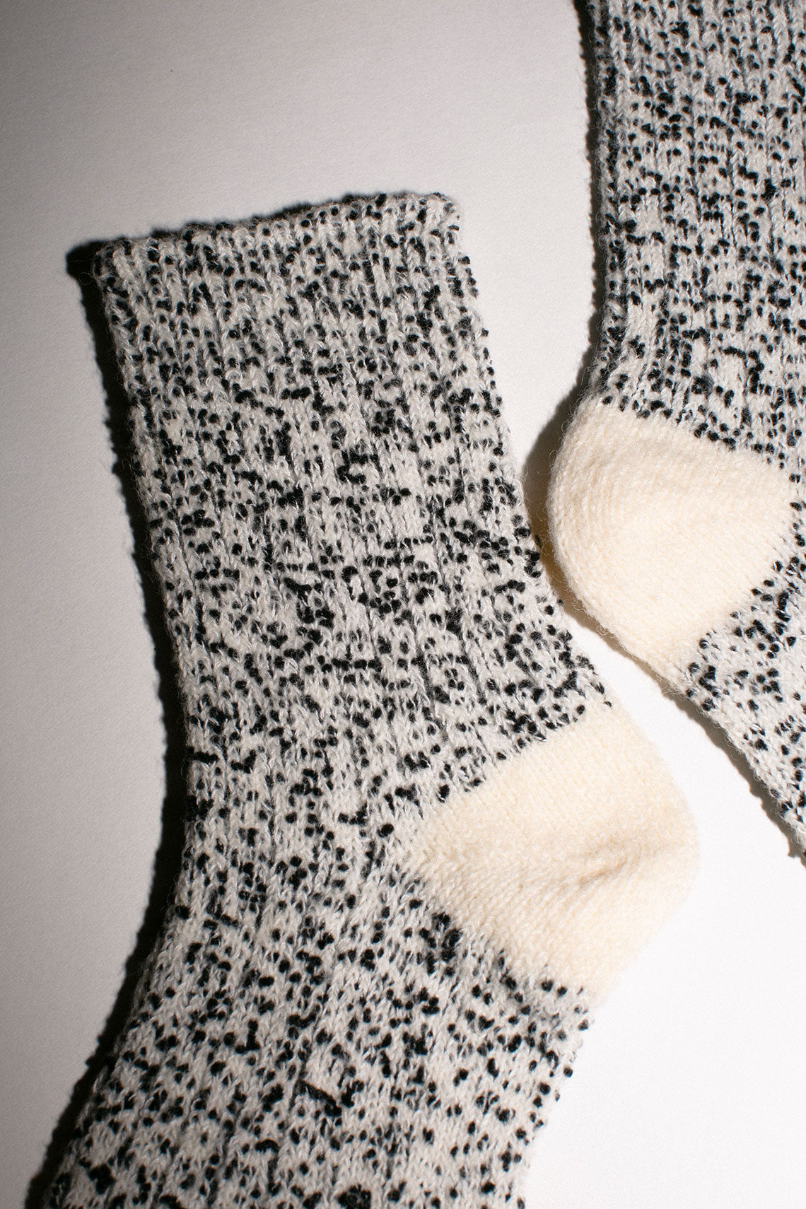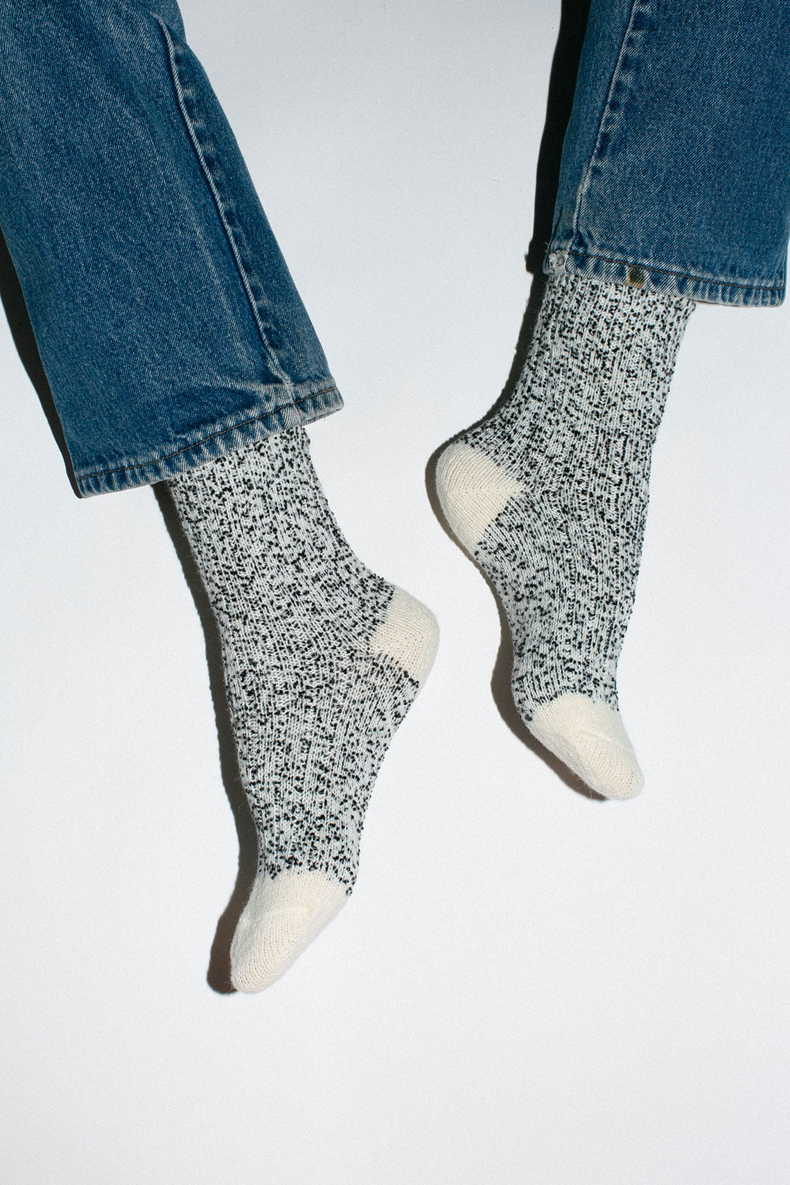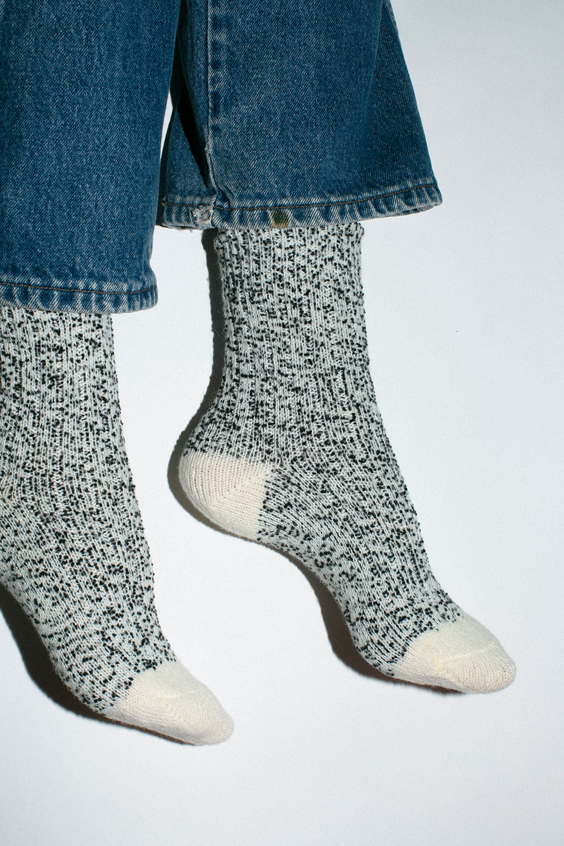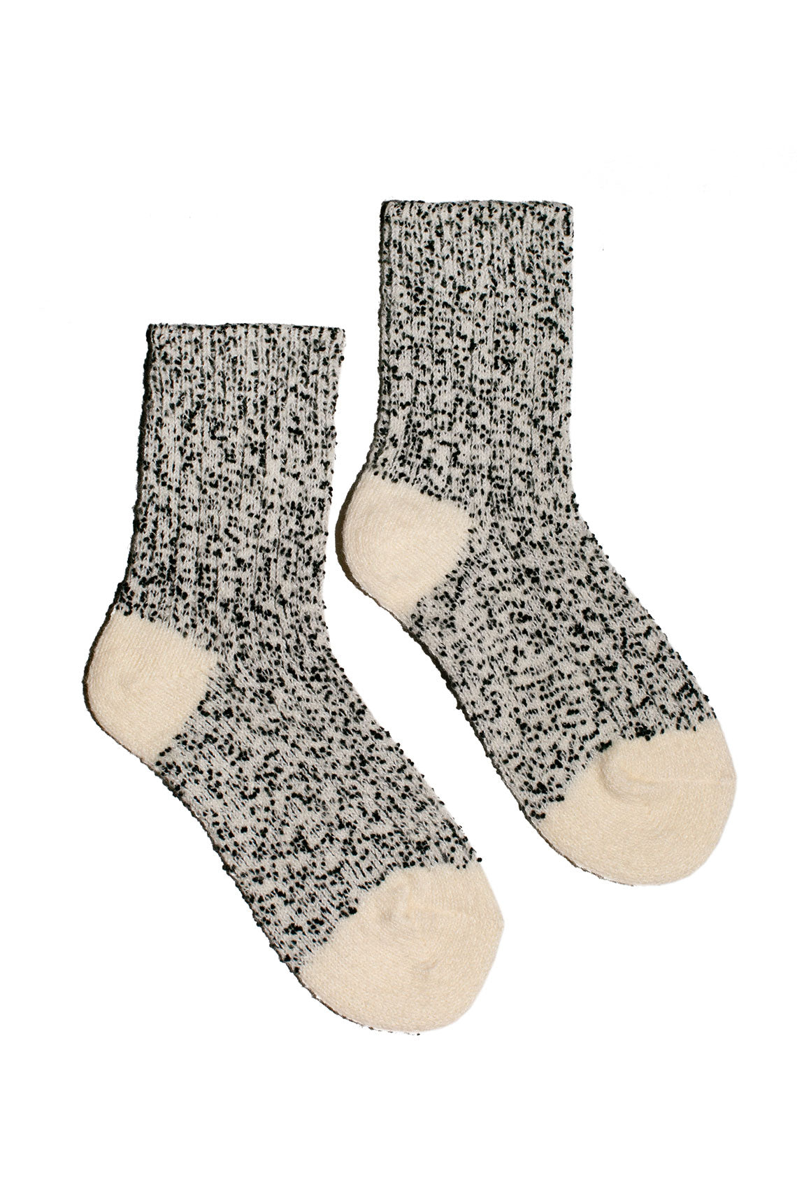 Cozy black and white speckled socks. Fabric is 62% acrylic 28% nylon 10% wool.