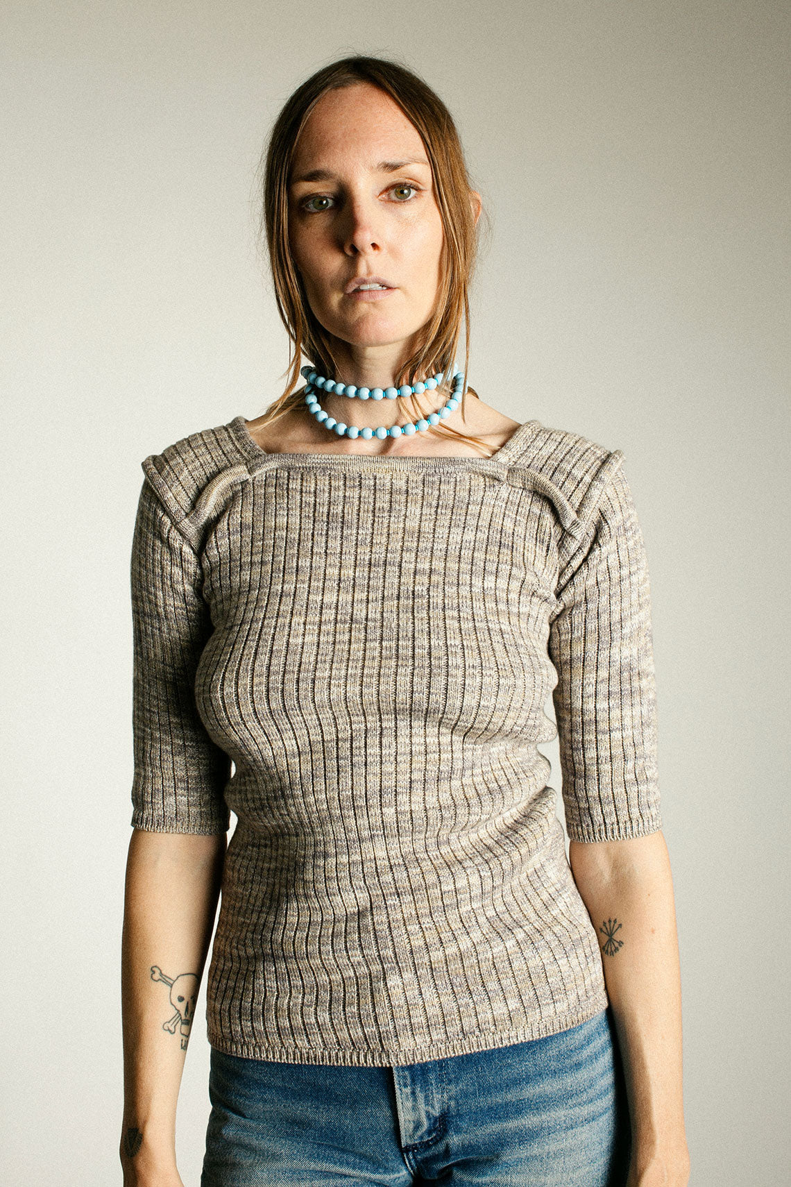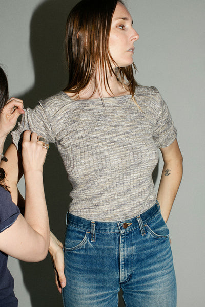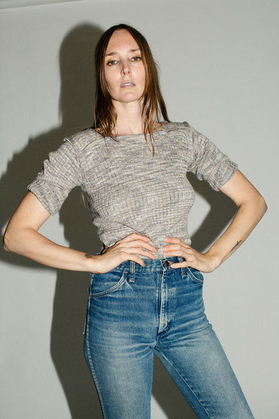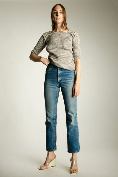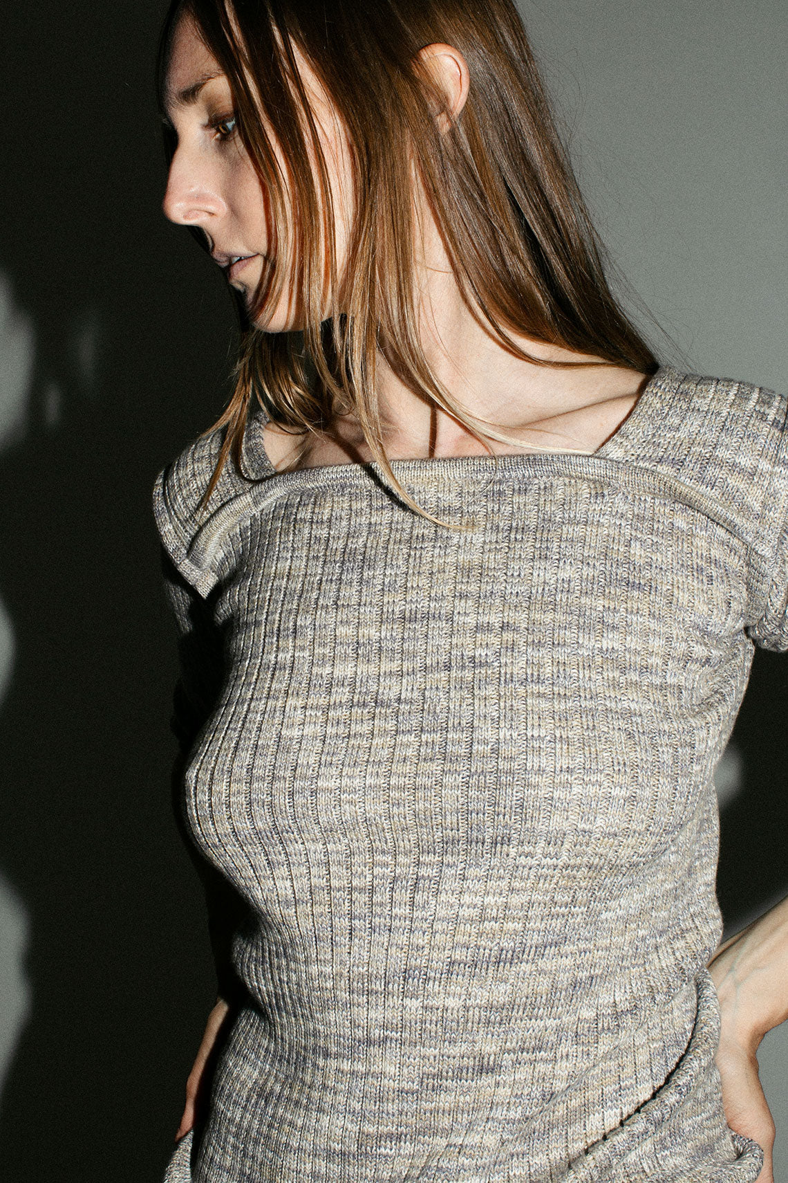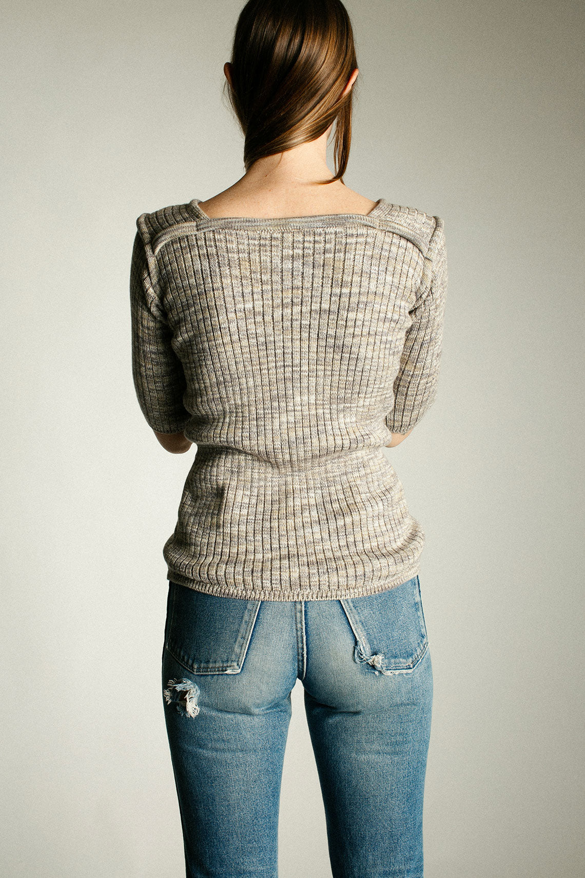 Ribbed square neck knit top with 3/4 length sleeves. Fabric is 100% organic cotton.