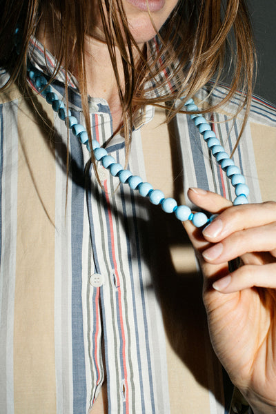 Sweetest pastel blue10mm wooden beads on a matching elastic cord with a metal ring and clasp. Wear as a necklace, keychain, or bracelet. 29.5" total length.