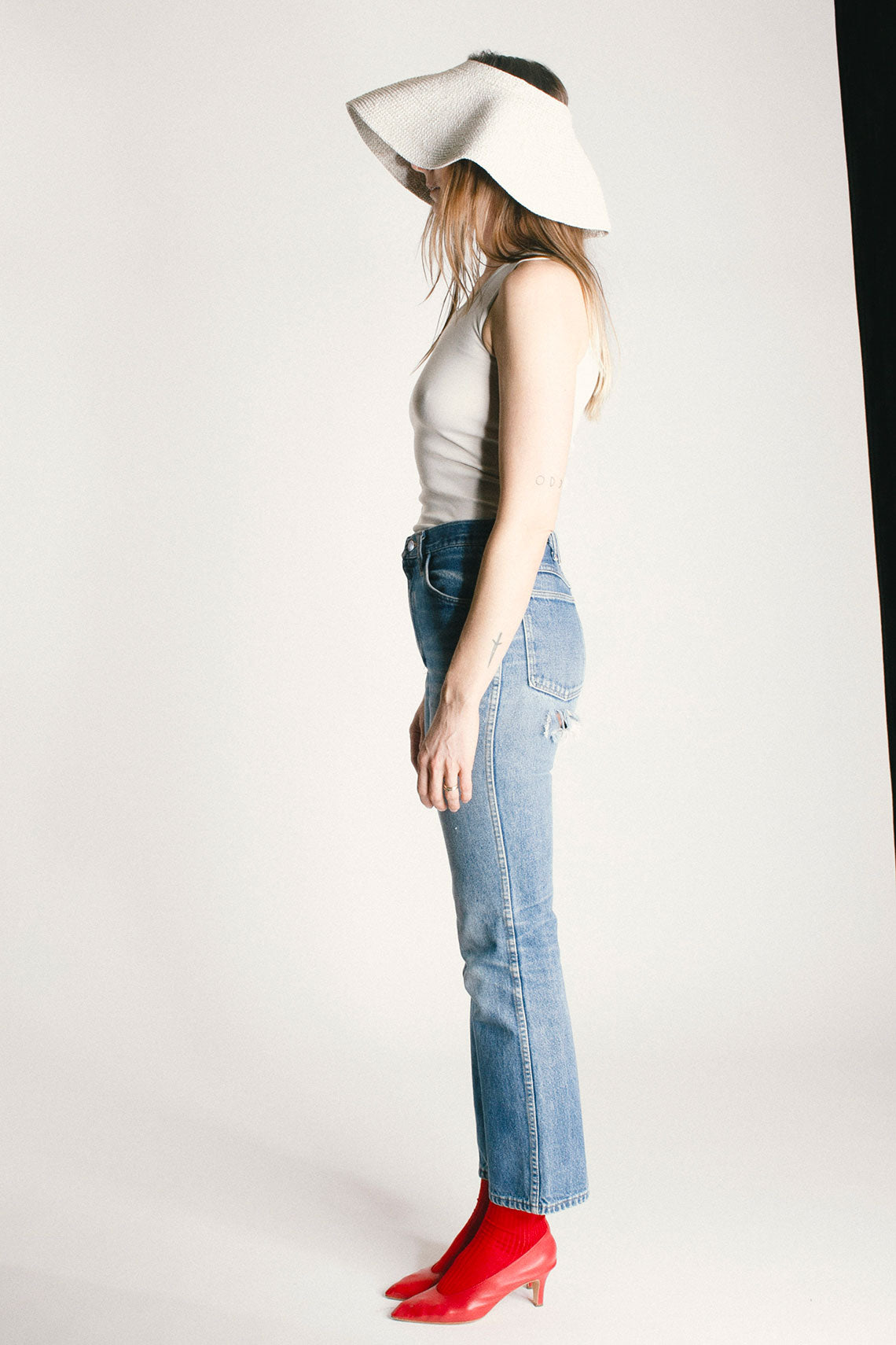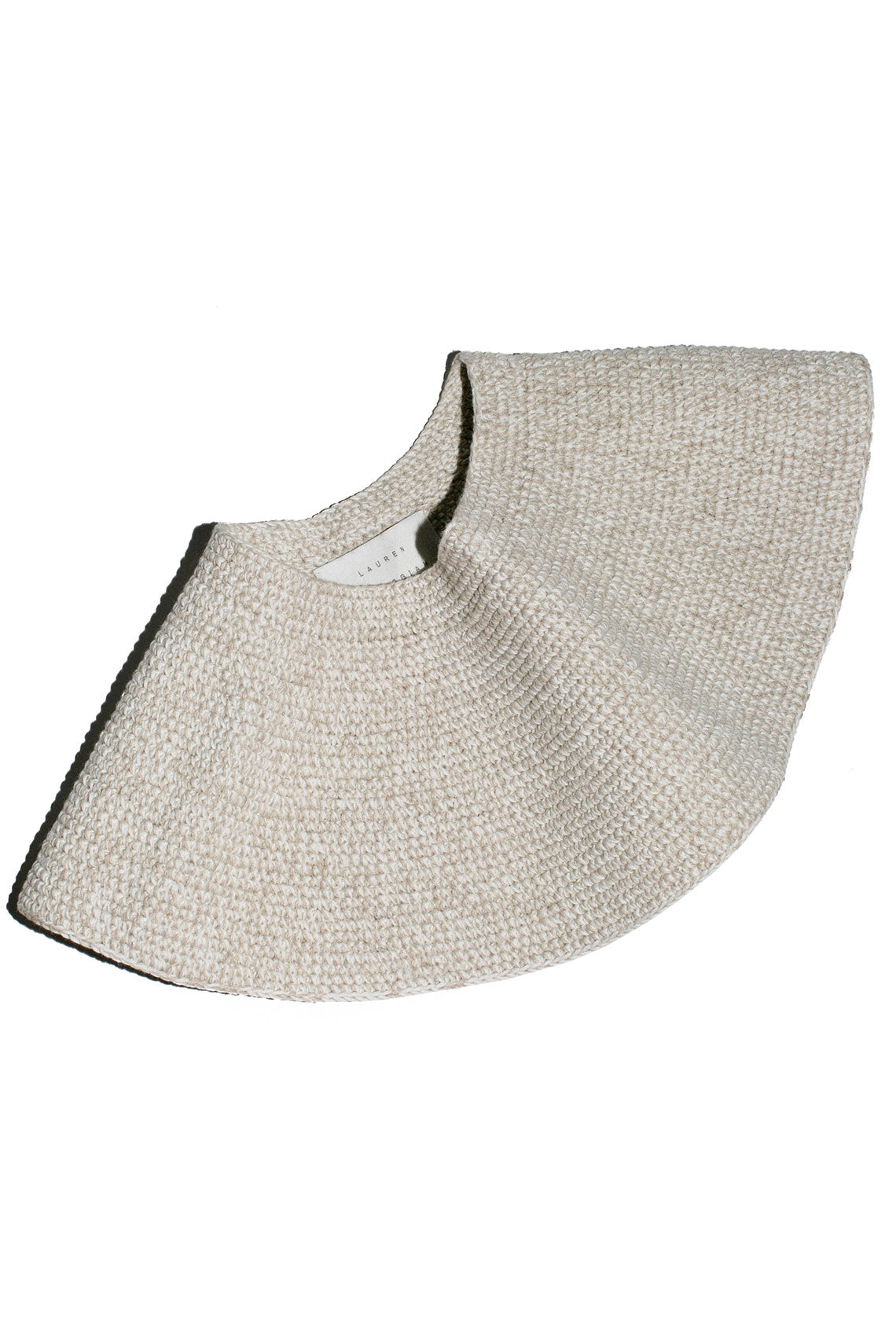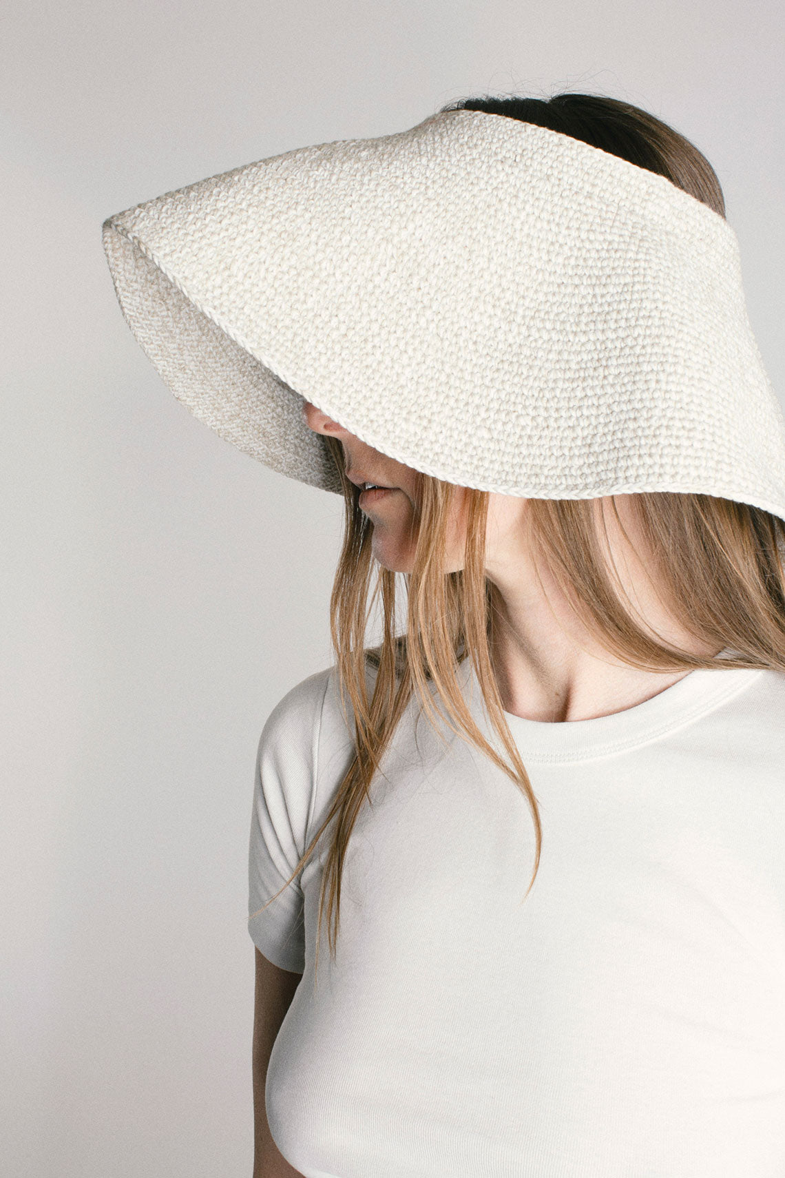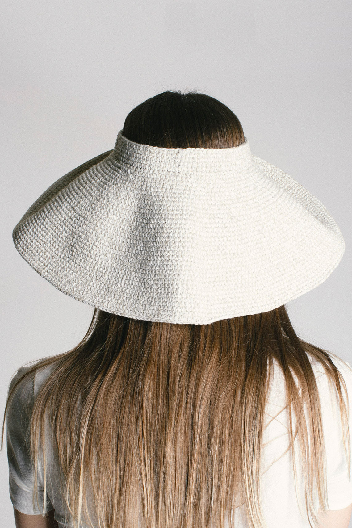 A big brim marled yarn hat with an open crown and visor silhouette. Circular shape hat is collapsible. Fabric is 70% pima cotton, and 30% linen.