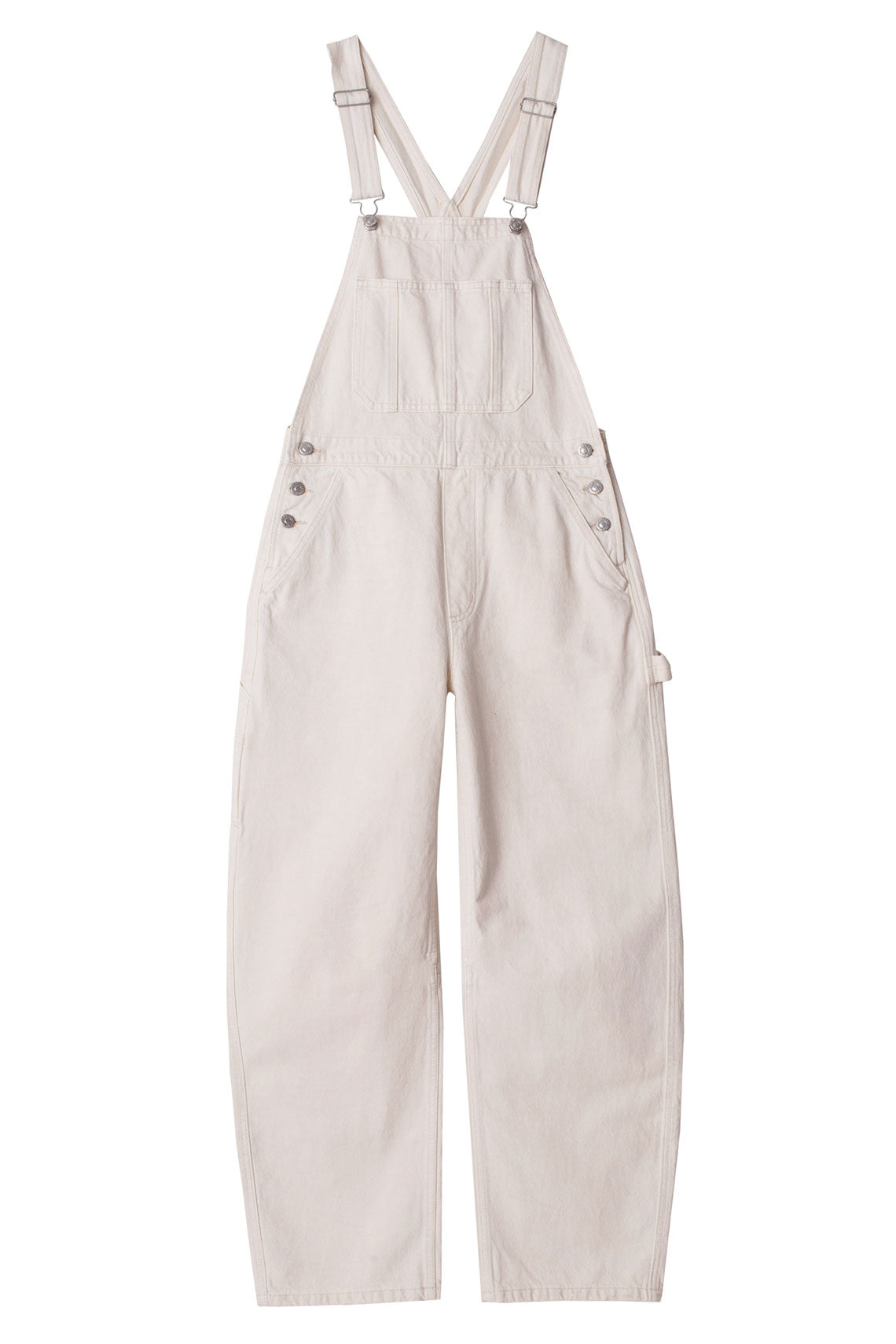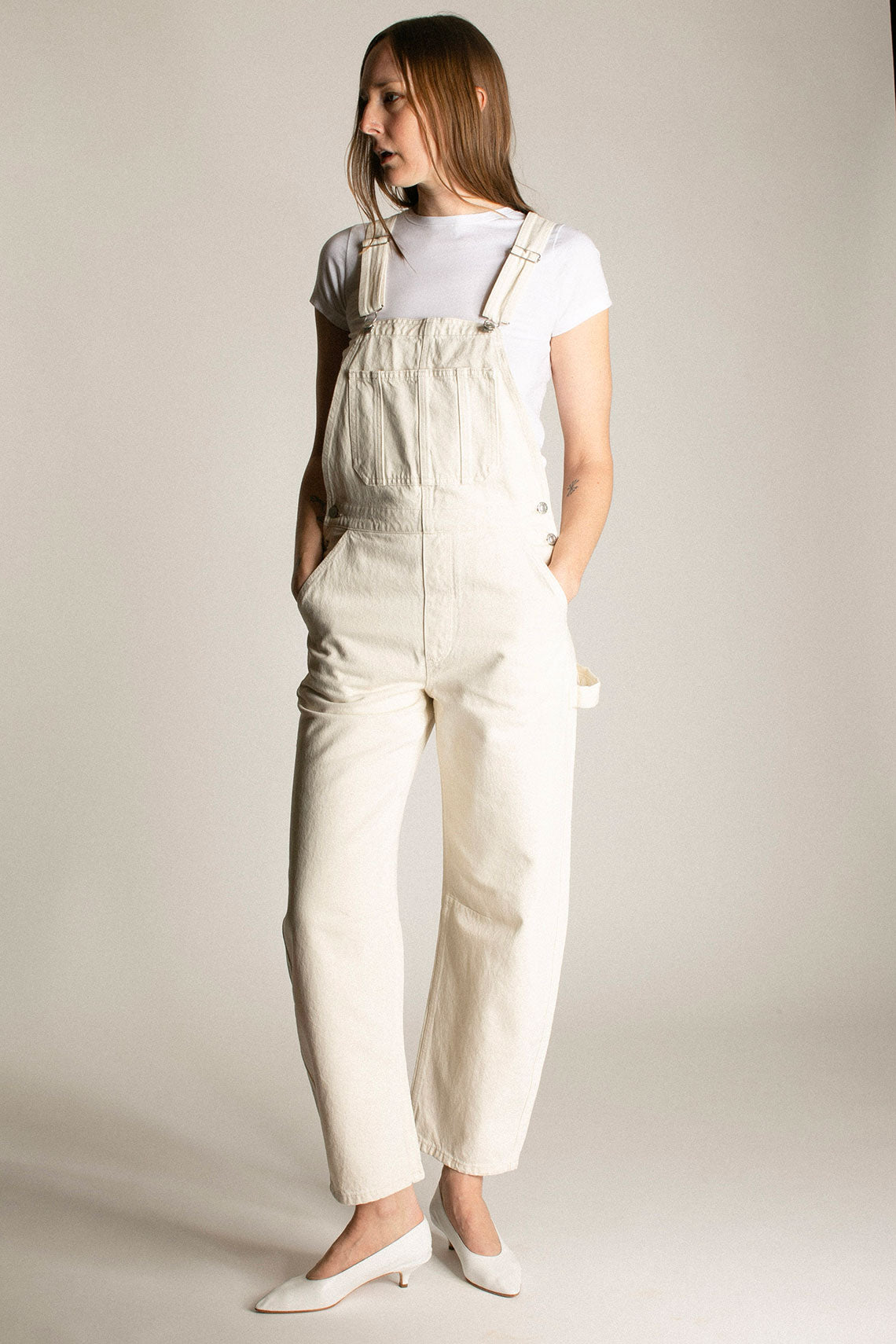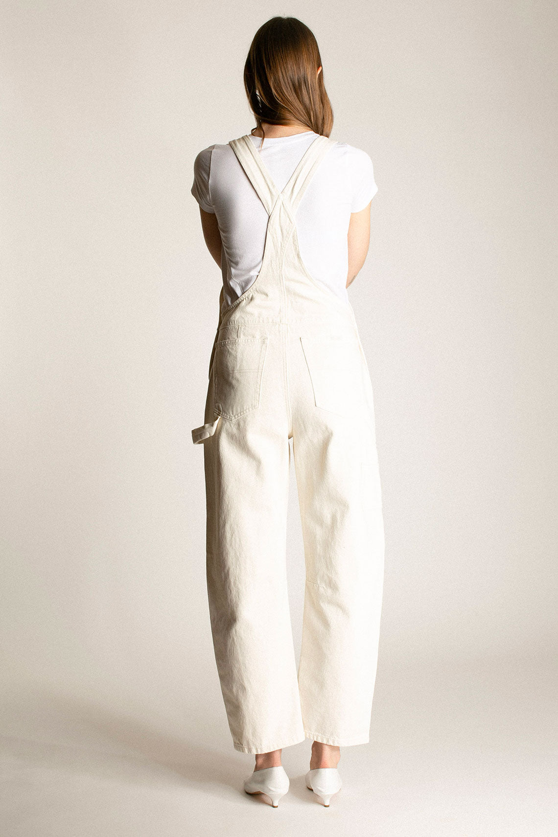 Relaxed barrel leg overall with adjustable straps, side shank closures, and brushed gold hardware. Fabric is 100% cotton.
