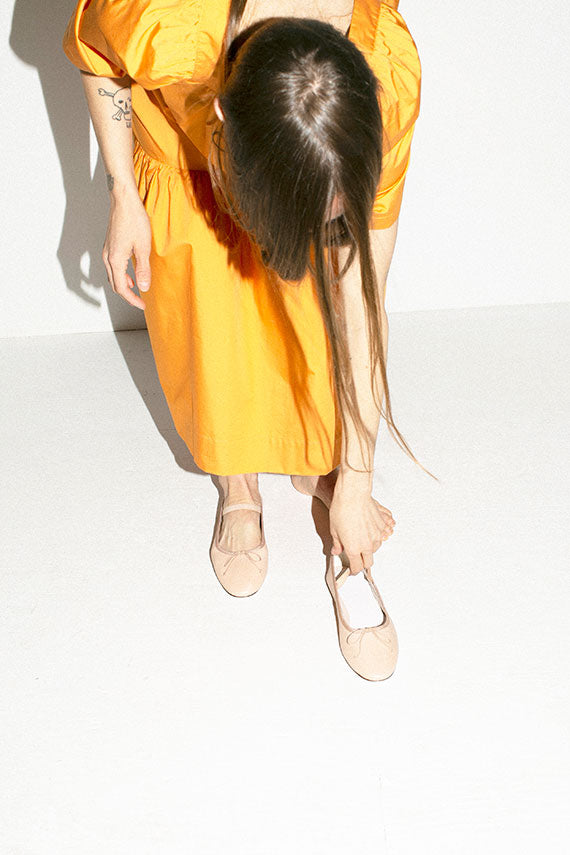 Looks just like the real thing but with a sole that makes it a little more durable and suitable for outdoor wear. 100% lamb leather with a padded foot bed, elastic strap and bow detail.