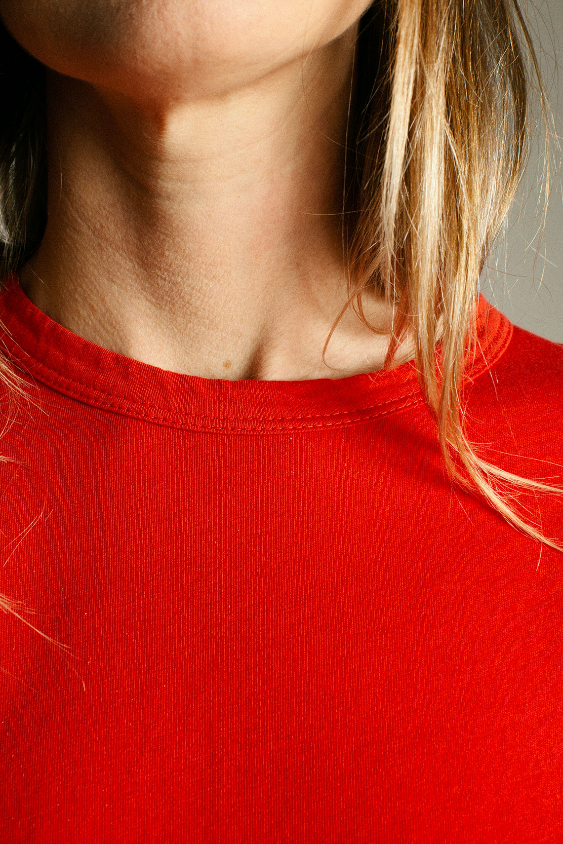 Slim silhouette basic crew neck with self-binding. Fabric is 100% organic cotton.